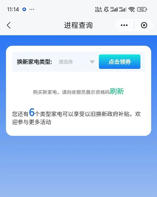 系統(tǒng)校驗(yàn)用戶的以舊換新資格,校驗(yàn)成功后,彈窗提示,用戶點(diǎn)擊確認(rèn),進(jìn)入領(lǐng)券界面,在“換新家電類(lèi)型”的下拉框中選擇要領(lǐng)券的品類(lèi),點(diǎn)擊領(lǐng)券。頁(yè)面彈窗提示:“確認(rèn)要領(lǐng)取該類(lèi)型的政府補(bǔ)貼券嗎?領(lǐng)取成功后將無(wú)法修改!”,點(diǎn)擊確定。領(lǐng)券成功,界面顯示以舊換新資格碼。